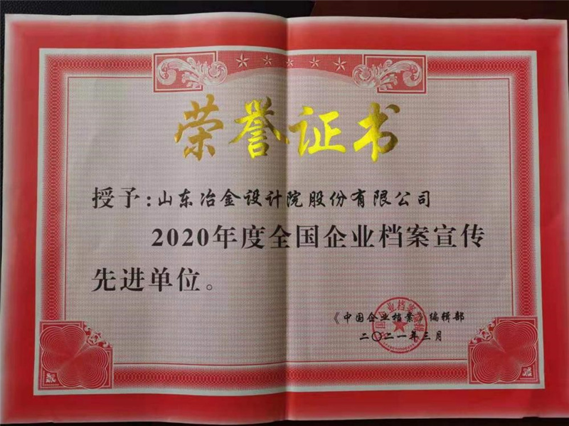 公司獲2020年度全國企業檔案宣傳先進單位榮譽